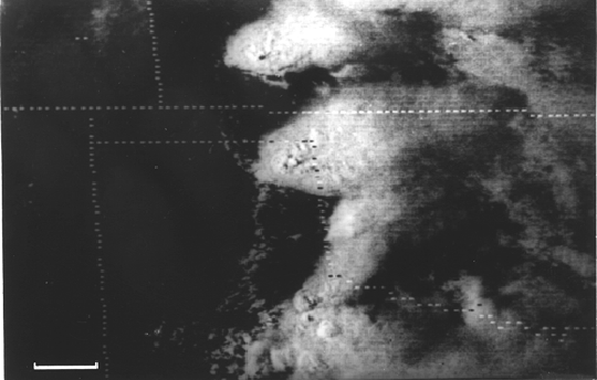 6. Visible wavelength satellite photograph of cumulonimbus anvils of supercell thunderstorms over Kansas, Oklahoma, and Texas. Bar is ~100 km.
