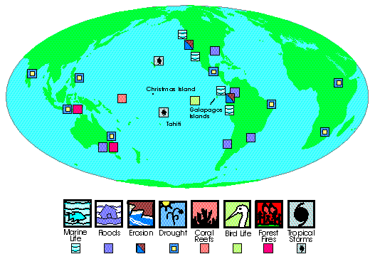 Subtle changes in the interplay of wind and water in the tropical Pacific can affect local ecosystems and human lives in far flung regions of the globe. Some of the documented environmental impacts of the 1982-1983 El Niño event, the strongest thus far this century, are indicated by symbols on this global map. Some of the icons within the globe are hyperlinked. Click on an icon of interest; if it isn't active yet, the map will take you back to the monograph page. As more photographs and narratives are received, they will be added to this map.