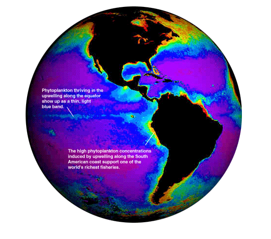 This satellite image from the Coastal Zone Color Scanner represents average conditions over several years. It shows the concentration of chlorophyll in the upper layer of the ocean, with higher amounts indicated by the warmer colors. Chlorophyll is produced by phytoplankton, the lowest level of the food web in the marine ecosystem. Phytoplankton "bloom" in the cold, nutrient-rich water that rises from the deep ocean into the sunlight, where photosynthesis can take place. (Image courtesy of Gene Carl Feldman, NASA, Goddard Space Flight Center.)