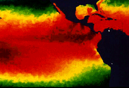 Sea surface temperature looked markedly different on May 13, 1992, a time of El Niño conditions when the thermocline in the eastern Pacific was deeper than normal and equatorial upwelling was suppressed. Note the absence of the well-defined cold tongue. (Image courtesy of Otis Brown, University of Miami and Gene Carl Feldman, NASA, Goddard Space Flight Center.)