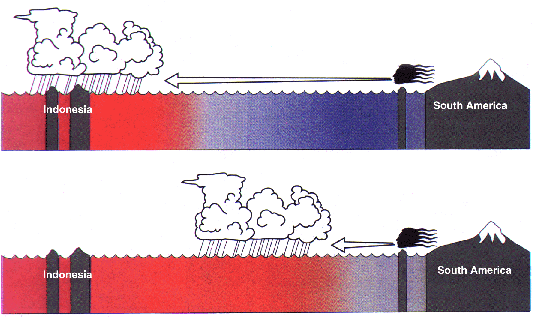 El Niño rearranges the distribution of rainfall in the equatorial Pacific. During normal years (top figure) upwelling induced by the easterly surface winds along the equator (arrow) keeps the surface waters of the central Pacific cool (blue). Heavy rainfall is confined to the warm (red) waters surrounding Indonesia at the western end of the Pacific. During El Niño (bottom figure) the easterly surface winds weaken and retreat to the eastern Pacific, allowing the central Pacific to warm, and the rain area to migrate eastward.