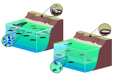 These figures show the stark contrast between the marine ecosystem along the Ecuador and Peru coasts in normal (left) versus El Niño years (right). The warm, nutrient-poor surface waters brought by El Niños can sustain few phytoplankton, the tiny creatures that make up the base of the marine food web. As a result, fish, sea lions, and other sea animals must dive deeper in search of food. Sea birds scatter across the ocean, abandoning their young.