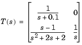 T(1,1) = tf(1,[1 0.5]); T(:,2) = [ 1 ; tf(0.4,[1 0]) ] Transfer function from input 1 to output... 1 #1: ------- s + 0.5 s - 1 #2: ------------- s^2 + 2 s + 2 Transfer function from input 2 to output... #1: 1 0.4 #2: --- s