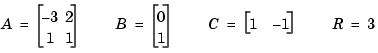 a = [-3 2;1 1] b = [0 ; 1] c = [1 -1] r = 3 [x,l,g] = care(a,b,c'*c,r)