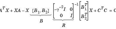 B = [B1 , B2] m1 = size(B1,2) m2 = size(B2,2) R = [-g^2*eye(m1) zeros(m1,m2) ; zeros(m2,m1) eye(m2)] X = care(A,B,C'*C,R)