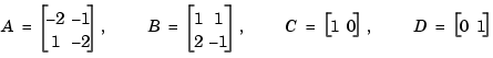 sys = ss([-2 -1;1 -2],[1 1;2 -1],[1 0],[0 1]) tf(sys) Transfer function from input 1 to output: s ------------- s^2 + 4 s + 5 Transfer function from input 2 to output: s^2 + 5 s + 8 ------------- s^2 + 4 s + 5