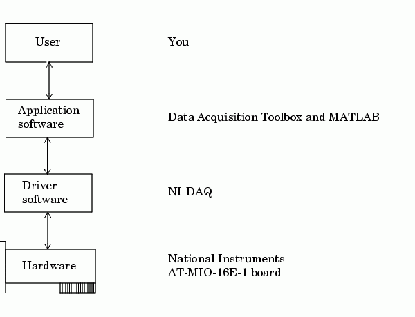 For example, suppose you are using the Data Acquisition Toolbox with a National Instruments AT-MIO-16E-1 board and its associated NI-DAQ driver. The relationship between you, the driver software, the application software, and the hardware is shown below.