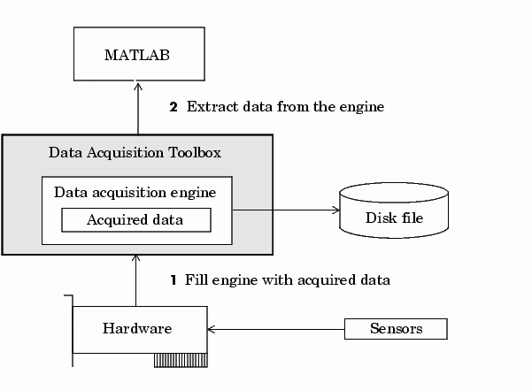 While the engine performs these tasks, you can use MATLAB for other tasks such as analyzing acquired data. In other words, the engine and MATLAB are asynchronous. The relationship between acquiring data, outputting data, and data flow is described below.
