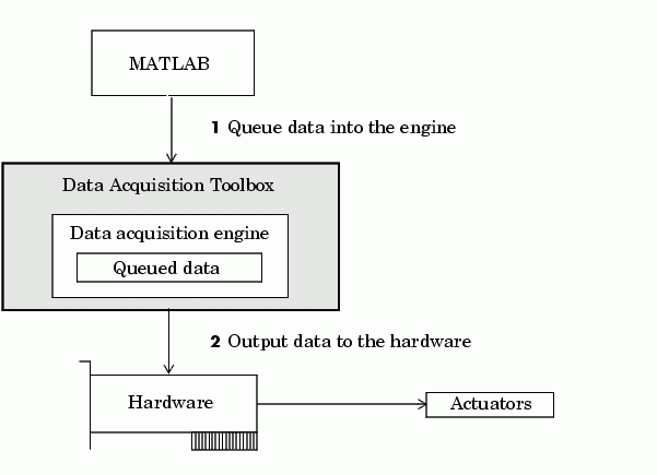 Outputting data means that data is flowing from the data acquisition engine to the hardware device. However, before data is output, you must queue it in the engine with the putdata