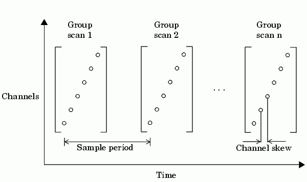 Since these channels cannot be sampled simultaneously, a time gap exists between consecutively sampled channels. This time gap is called the channel skew. The channel skew and the sample period is illustrated below.