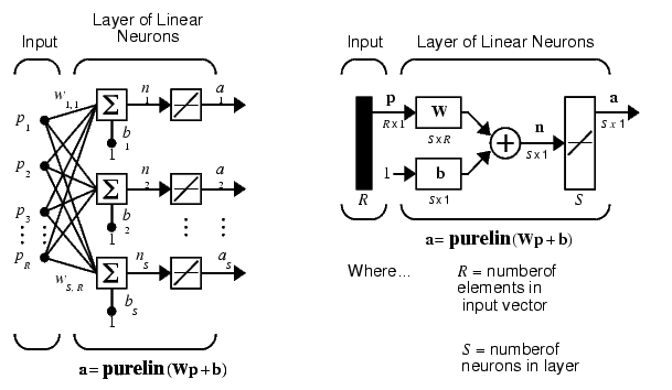 The ADALINE network shown below has one layer of S neurons connected to R inputs through a matrix of weights W.