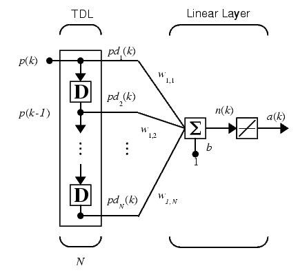 We can combine a tapped delay line with an ADALINE network to create the adaptive filter shown below.