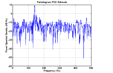randn('state',1) fs = 1000; % Sampling frequency t = (0:0.3*fs)./fs; % 301 samples A = [2 8]; % Sinusoid amplitudes (row vector) f = [150;140]; % Sinusoid frequencies (column vector) xn = A*sin(2*pi*f*t) + 5*randn(size(t)); periodogram(xn,boxcar(length(xn)),1024,fs);