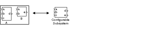 In this example, port a on the Configurable Subystem block connects to port a of the selected library block no matter which block is selected. On the other hand, port c on the Configurable Subsystem block functions only if library block A is selected. Otherwise, it simply terminates.