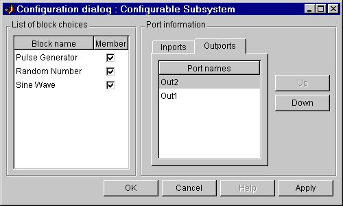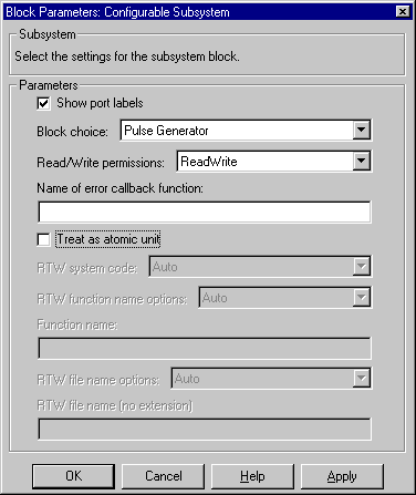 The following figure shows the dialog box for a Configurable Subystem block.