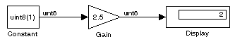 data type (0 to 255). Thus, this model simulates without error. However, if the gain were slightly larger (for example, 256), Simulink would signal an out-of-range error if you attempted to simulate the model.