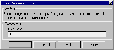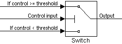The Switch block propagates one of two inputs to its output depending on the value of a third input, called the control input. If the signal on the control (second) input is greater than or equal to the Threshold parameter, the block propagates the first input; otherwise, it propagates the third input. This figure shows the use of the block ports.