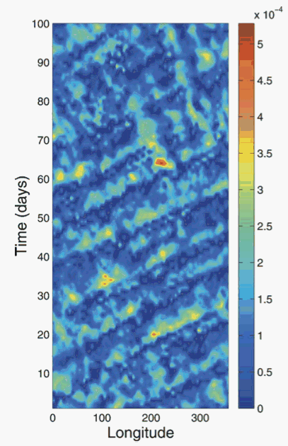 As seen in the figure above (an unfiltered space-time diagram of precipitation