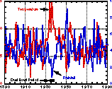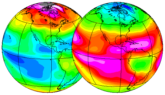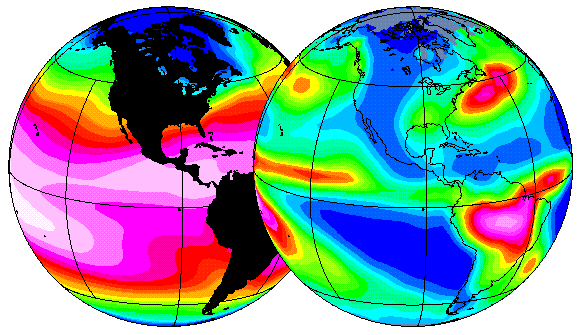 Caption: The four disks on these pages show some important climate variables over the Americas. From left to right they show Sea Surface Temperature, rainfall, Earth's albedo, and the infrared energy emission. All these plots are averages for the December through January season, and in each case higher values are indicated in reds and lower values are indicated in blues.