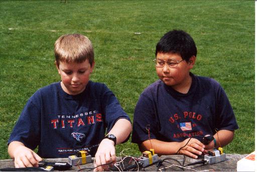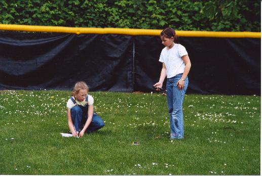 Students making measurements. The Thermocouple Electronic box is between students on the grass. Right student, has the voltmeter and is reading themperatures for the left student who is recording the data.