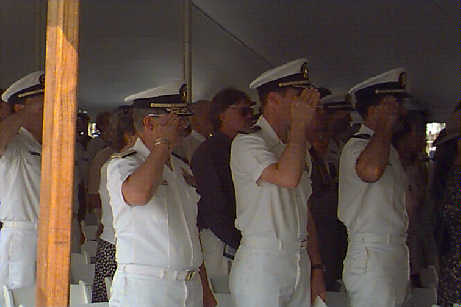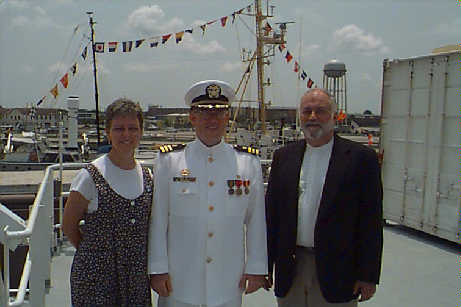 Mrs. Mary Landahl, Commander Peterson, and Mr. Grant Gray on commissioning day.