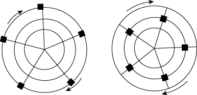 Fig. 2 Illustration of the conservation of angular momentum as applied to a rotating object with movable weights (denoted by the black squares). As the heating in the tropics and the cooling at lower latitudes continue, the equator-to-pole temperature contrast gradually increases, and so does the strength of the upper level westerlies. The resulting circulation in panel (c) resembles the observed circulation in some ways (i.e., like the Earth it has tradewinds and an equatorial rain belt, but it has no midlatitude westerlies and the deserts are in high latitudes rather than in the subtropics. Does the model have it wrong? No, we just have to be patient. Development of extratropical cyclones