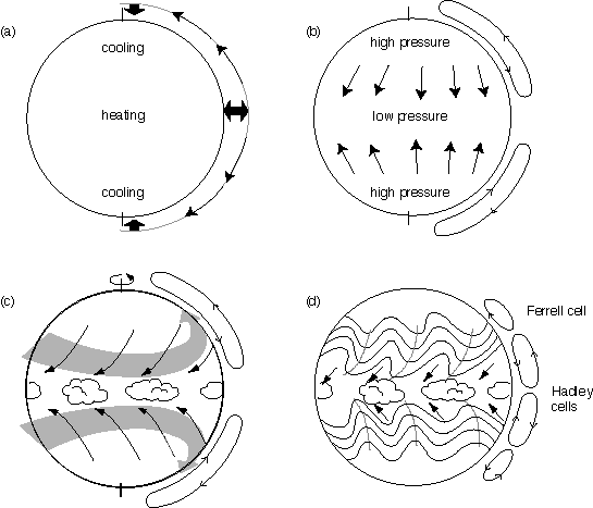 Let's consider a simplified 'Earth like' planet which has net radiative heating at the Tropics and cooling at the poles. To deduce what the climate of such a simplified planet would look like we rely on experiments that have been performed with numerical models of the atmospheric component of the climate system. When realistic land-sea geometry, mountains, and seasonal changes in solar heating are prescribed in these models, they yield quite realistic simulations of the observed climate. Therefore the model simulations of our idealized Earth-like planet should have some credibility. Simplified Earth-like planet with net heating at the tropics When such a model atmosphere is 'turned