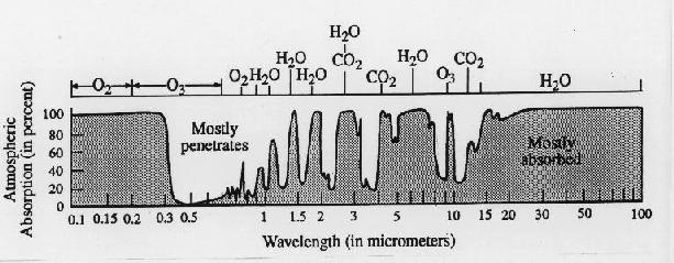5) Emitted Radiation: Wien's Law The wavelength at which the emission from a body is strongest is inversely proportional to its absolute temperature-- that is, the higher its temperature, the shorter the wavelength at which it emits radiation most strongly. This relationship is referred to in the text as Wien's law. Bodies the temperature of planets (i.e., hundreds of degrees K) emit virtually all their radiation in the infrared range (around 10 microns). The 'photosphere' of the sun (the layer from which the sun emits ~99% of its radiation) has a temperature of ~6000 K. Most of its radiation is in the visible and 'near infrared' parts of the spectrum between 0.3 and 2 microns. The thin ionized gases in the sun's corona are much hotter than the photosphere. They're responsible for the x-rays emitted by the sun. Fortunately for us, these gases are so thin that they don't emit very much radiation. 6) Absorption spectra of gases Not all materials behave as blackbodies. It was demonstrated in class that ice emits less radiation than a blackbody-- that's why the radiometer gave a reading of -3 C instead of 0 C for the temperature of the ice. A thin layer of a gas also behaves in a manner different from a black body. Instead of absorbing all the radiation incident on it and emitting its own radiation almost as a blackbody, it absorbs and emits radiation in narrow ranges of wavelengths referred to as absorption bands. At wavelengths of the electromagnetic spectrum that lie in between between their absorption bands, these layers of gas are transparent. Each kind of gas molecule has its own characteristic 'absorption spectrum'. Gases like ozone (O3) water vapor (H2O) and carbon dioxide (CO2), whose molecules are comprised of three or more atoms, have more and stronger absorption bands in the infrared part of the spectrum than N2 and O2 have. Figure 3-13 in the text shows the absorption
