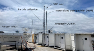 The logo for AGENA (Aerosol Growth in the Eastern North Atlantic) depicting red aerosols getting larger in the air as it gets closer to two islands in the water. AGENA campaign took place 1 June – 15 July 2022 at the US Department of Energy ARM Eastern North Atlantic (ENA) station. ENA is located on Graciosa Island, Azores, and is a permanent atmospheric radiation observatory. In collaboration with University of Wisconsin – Madison, Washington University in St. Louis and Stockholm University, we deployed an array of instrumentation to resolve the physical and chemical properties of aerosol particles over remote marine atmosphere. Specifically, the aim was to understand the chemical composition of oceanic emissions and which of the compounds are growing aerosol particles in this environment.